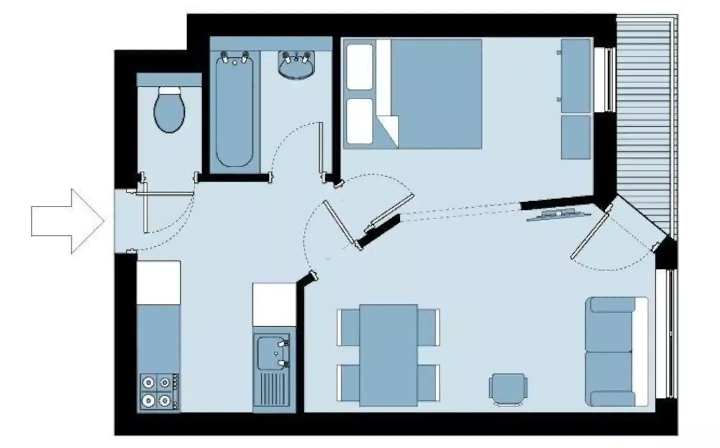 - Â Comfortable lounge with SMART TV (with Netflix), sofa bed, dining table & chairs, French windows leading to balcony with amazing views
