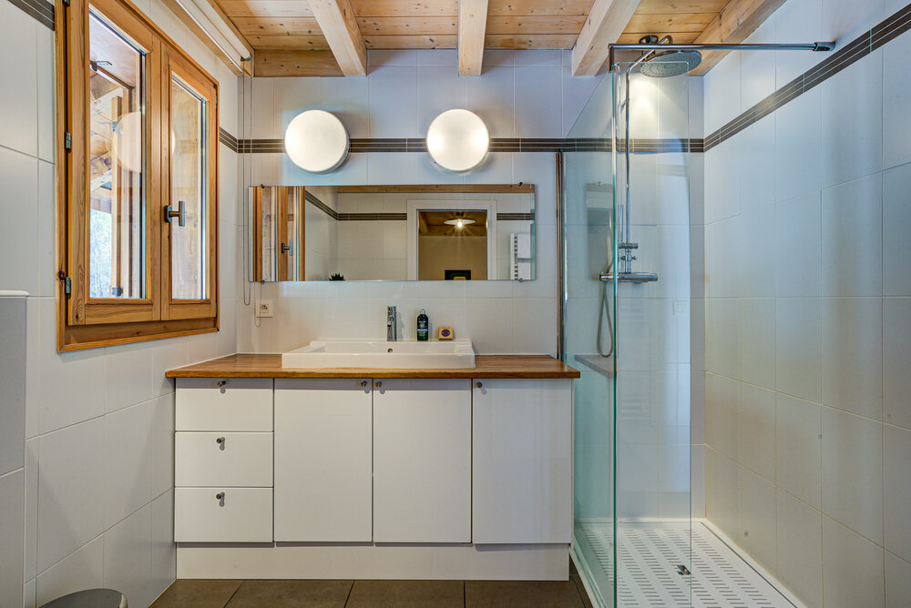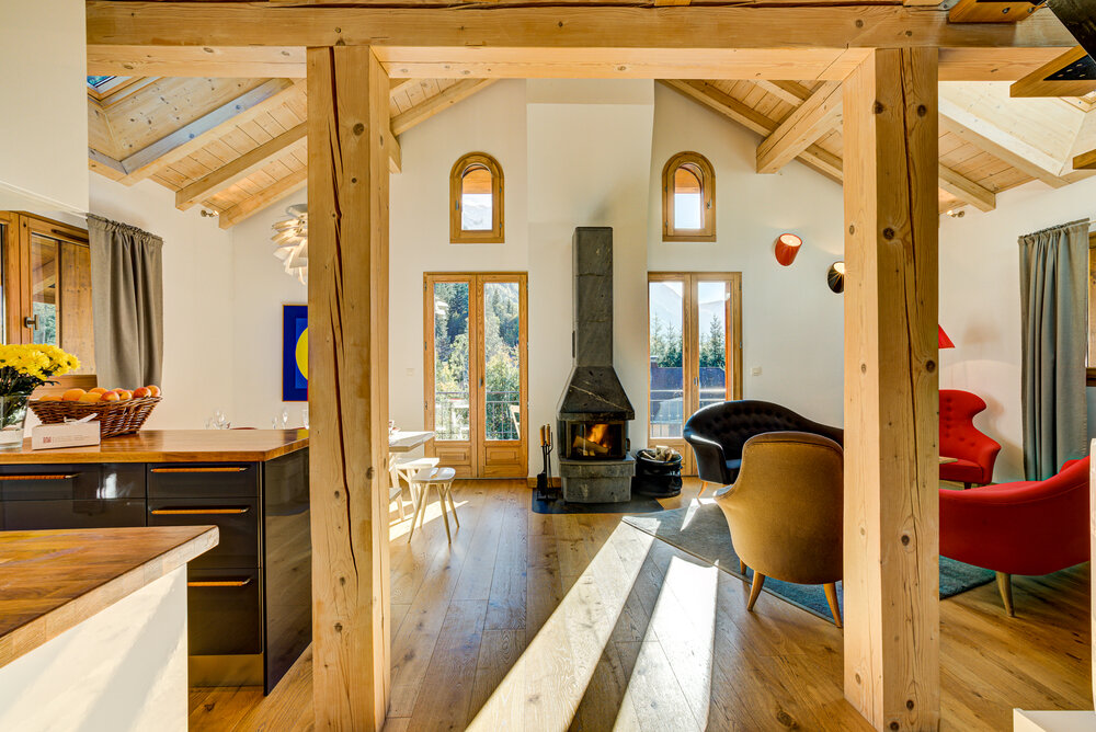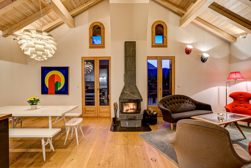 The fully-equipped kitchen and dining area is open towards the lounge with two comfortable sofas, armchairs and a wood burning stove. The french doors give you direct access to the private balcony with a view of Massif du Mont Blanc.