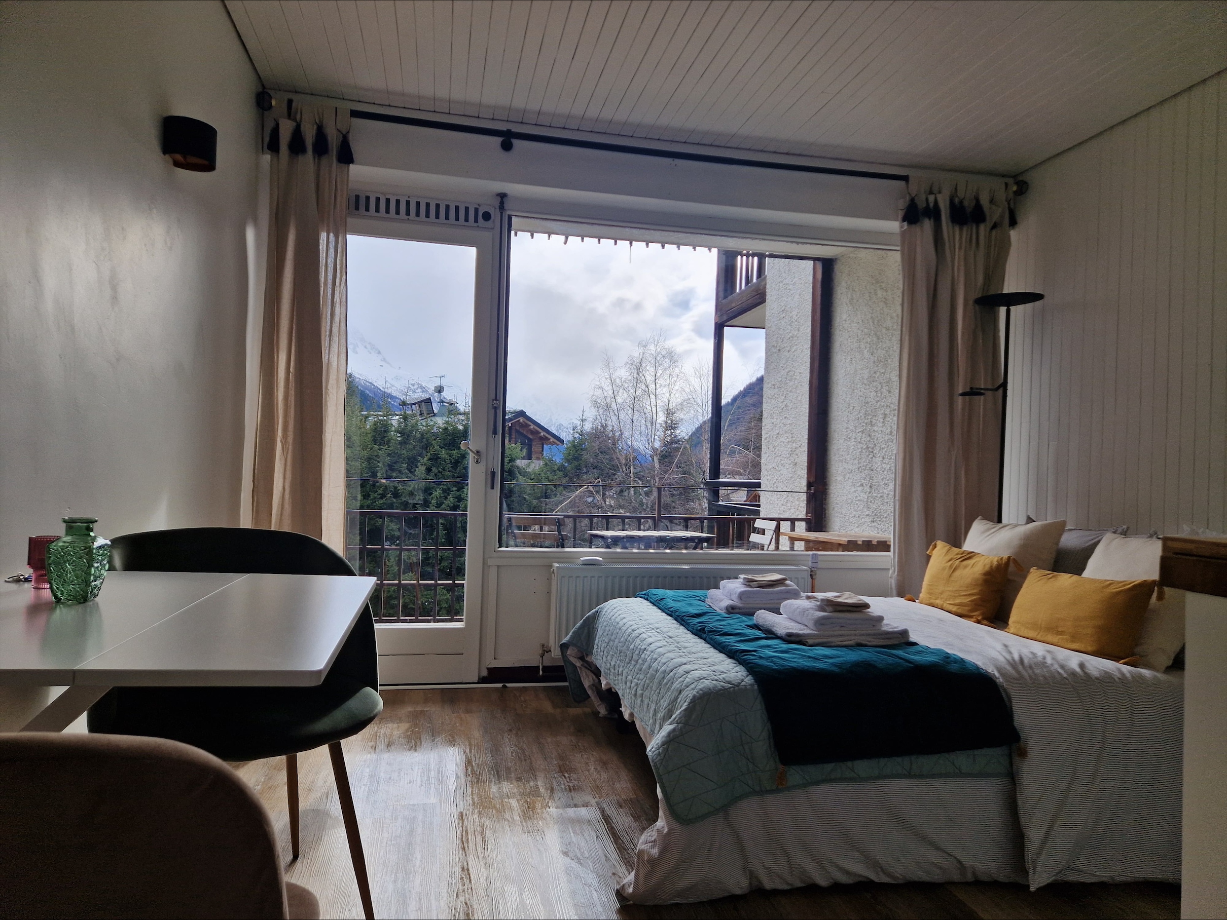 Enjoy a cozy, modern stay in this centrally located Argentière studio. Newly renovated and fully equipped, it features a big balcony with stunning views of the Chamonix Valley, Mont Blanc, and the Aiguille du Midi.