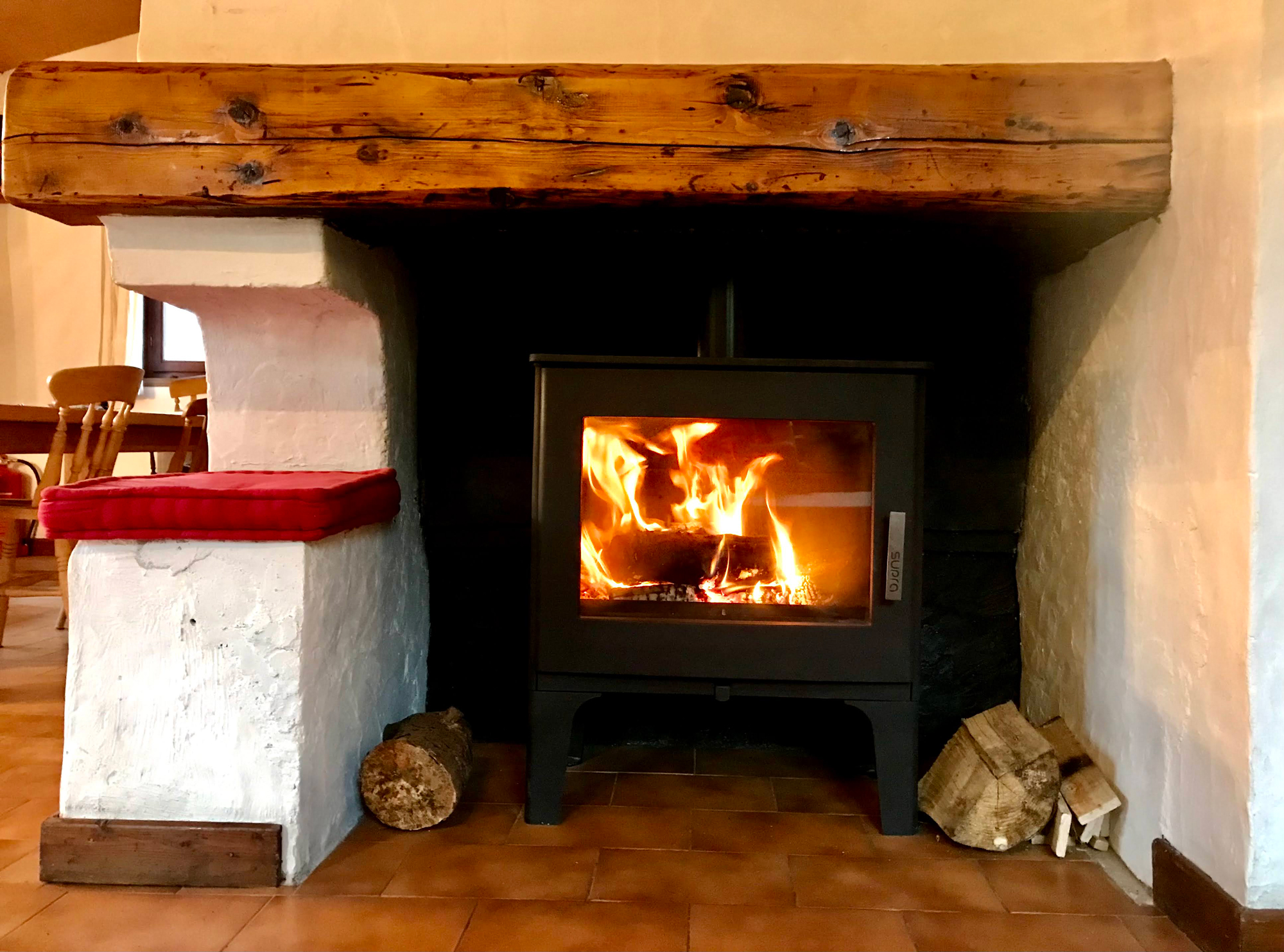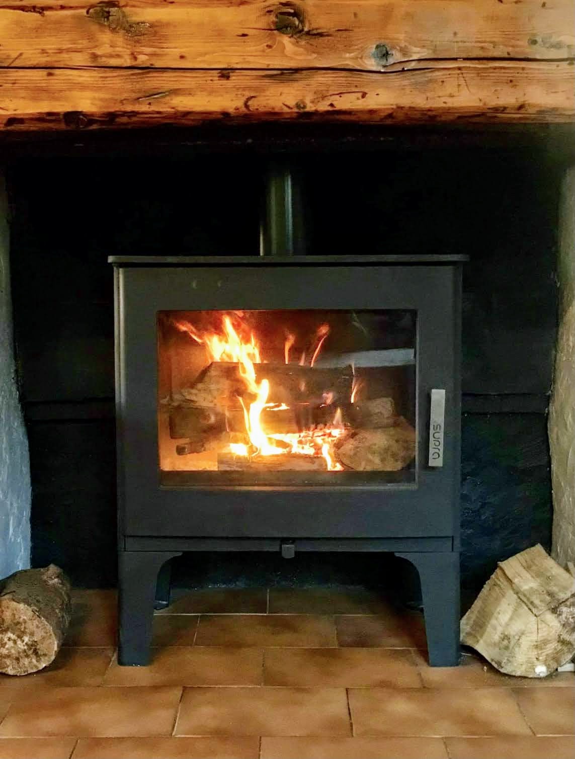 The lounge and dining area is a large airy open plan space with leather sofas, high beamed ceilings, large wood burning stove and a 3m long handmade solid oak dining table.