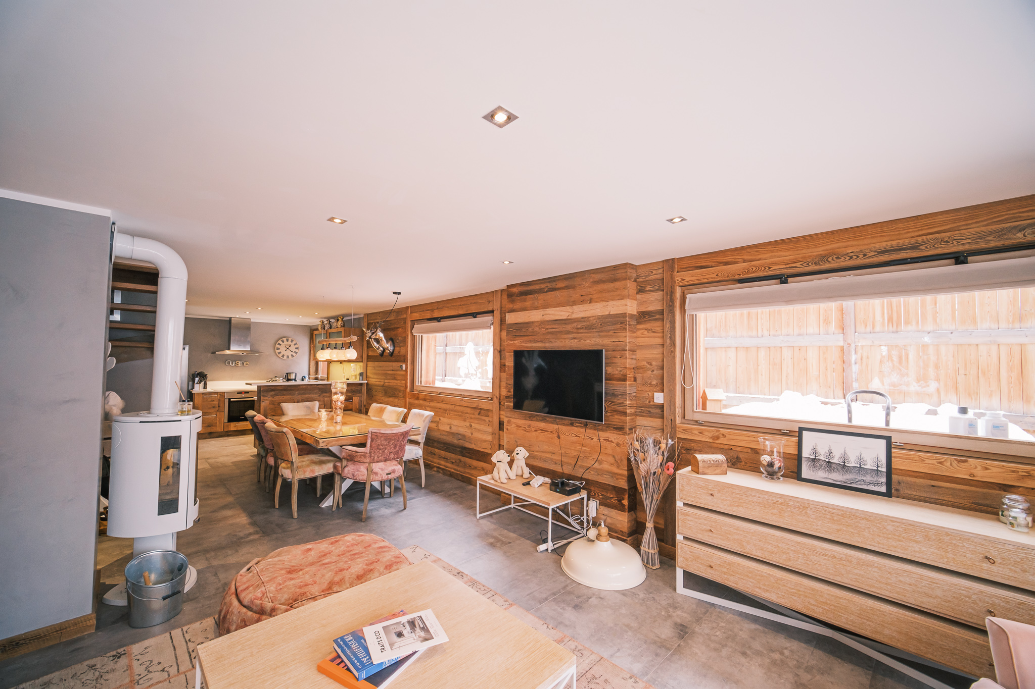 The beautiful living room with wood burning stove and open kitchen and the dining area is located on the ground floor to enjoy the terrace and outdoor jacuzzi. View Mont Blanc and Drus.