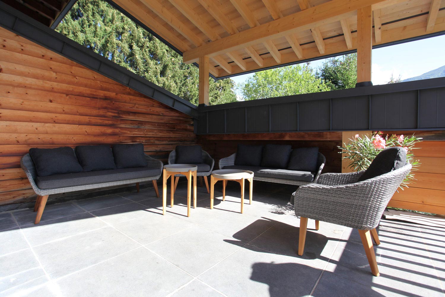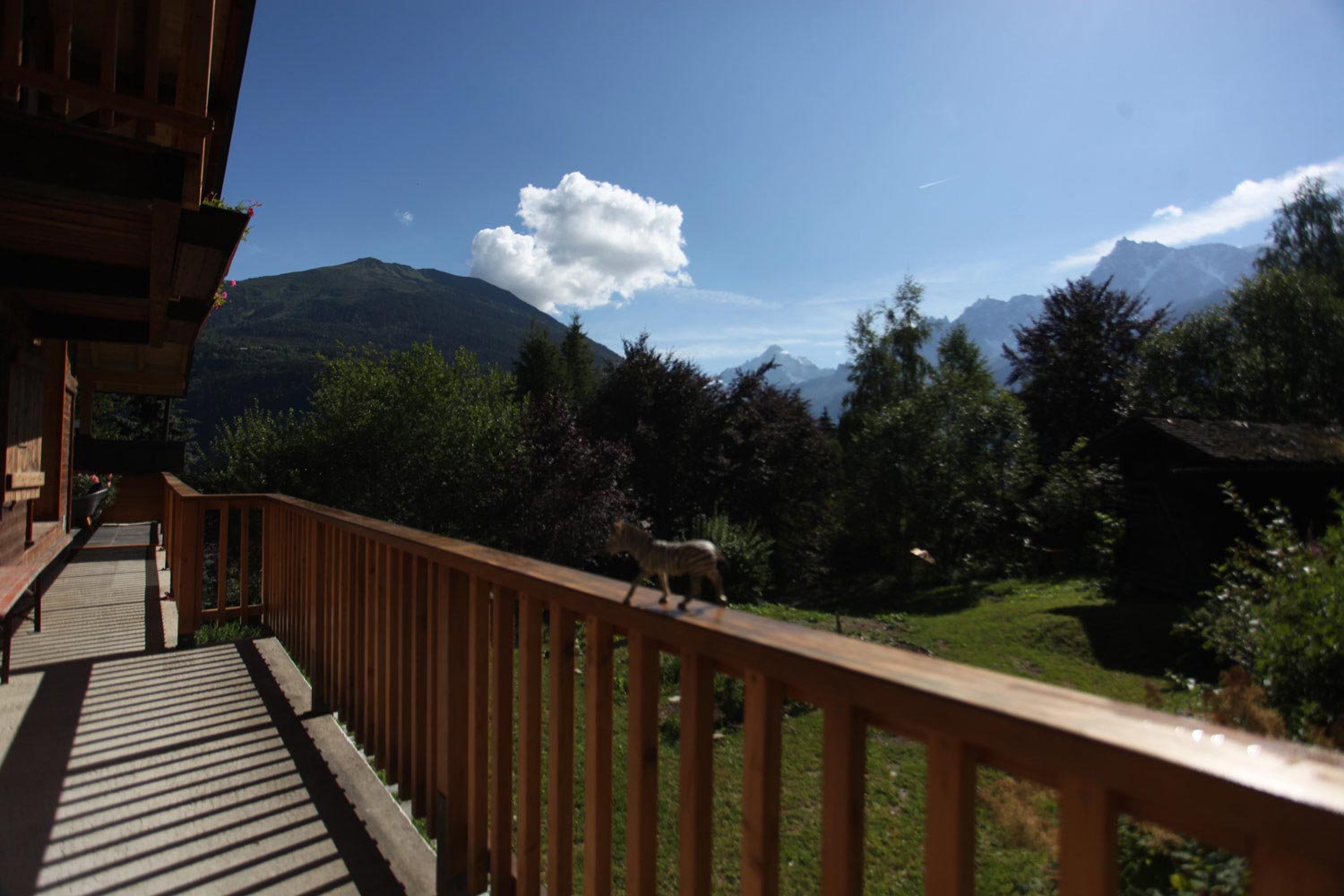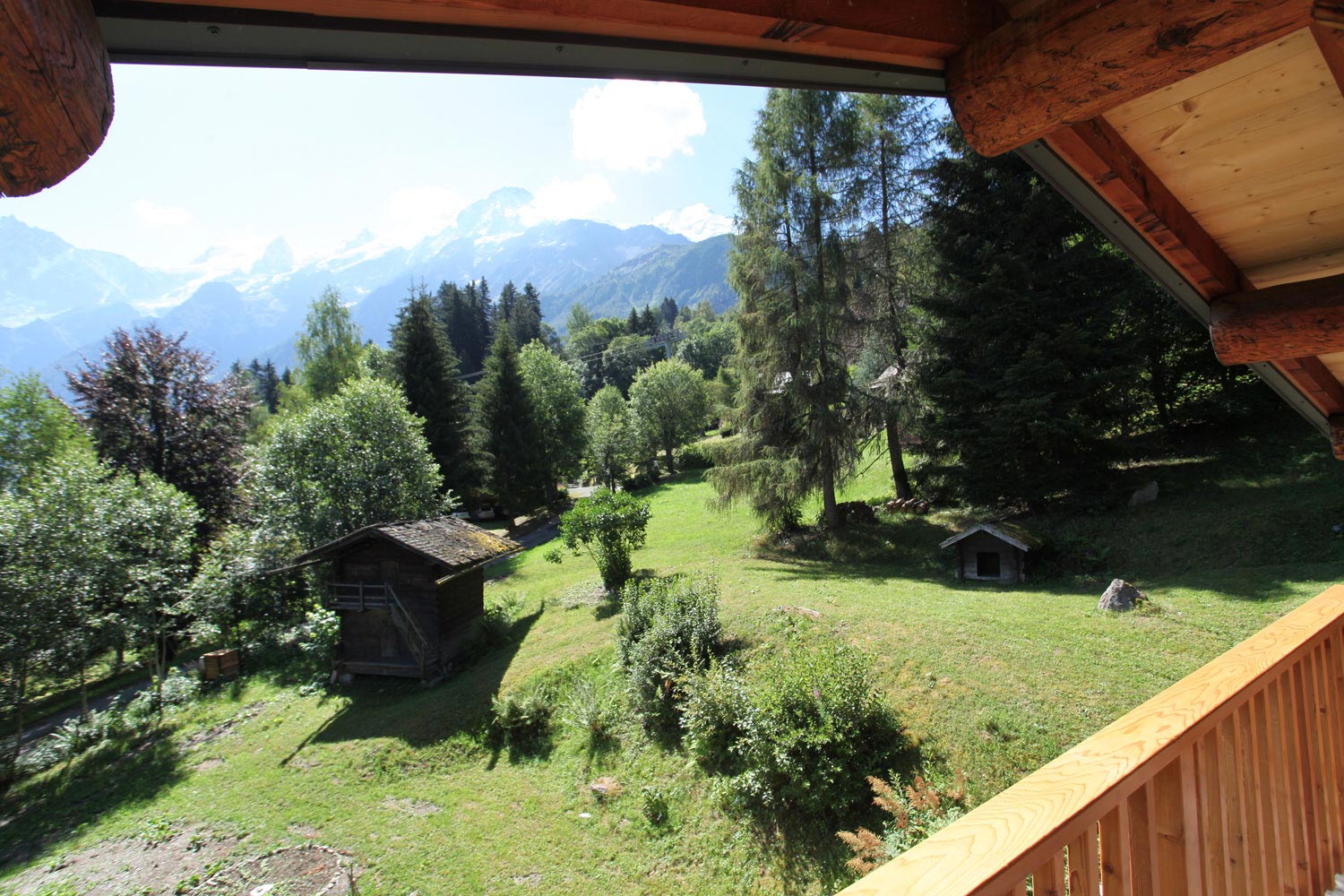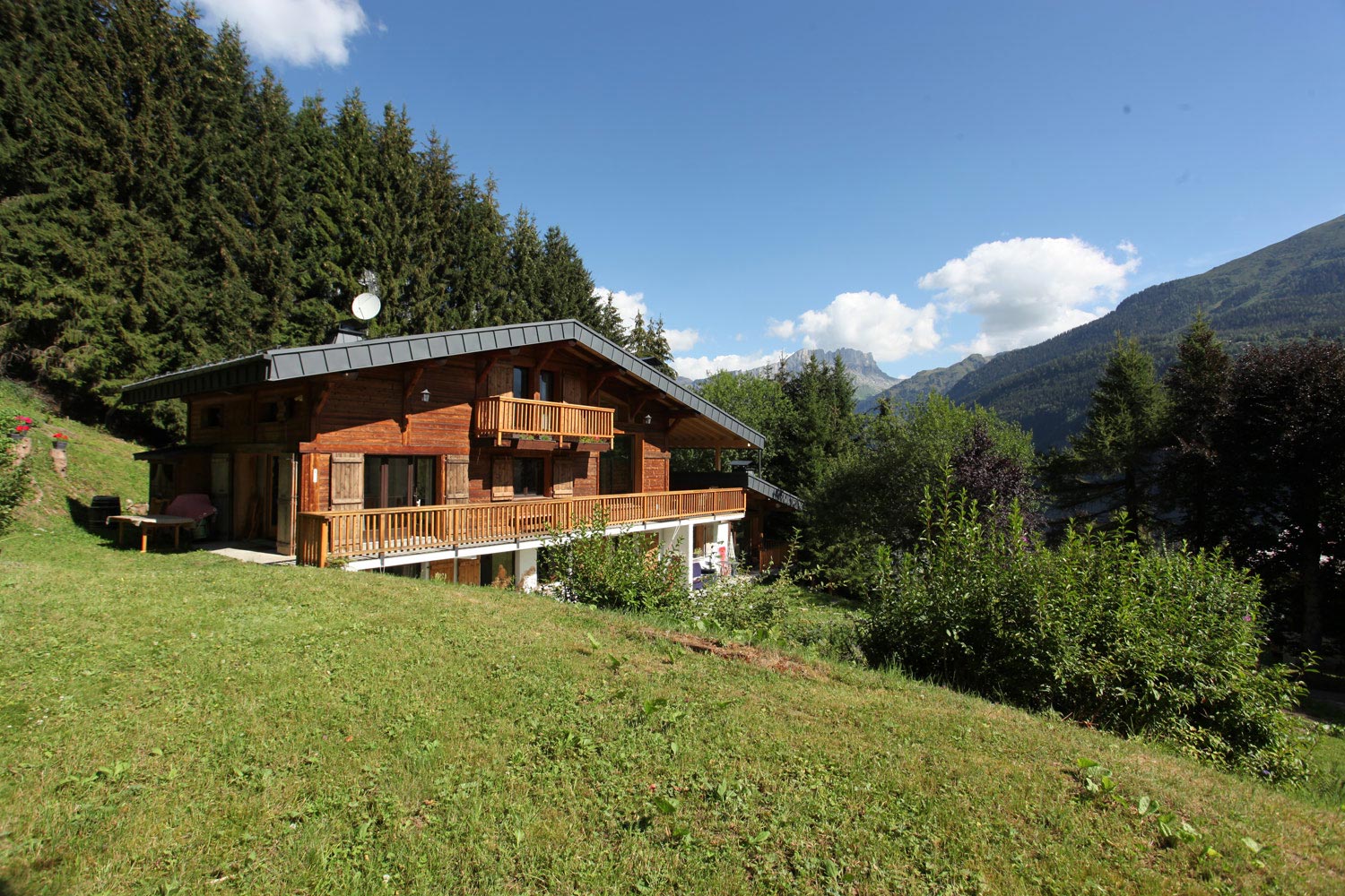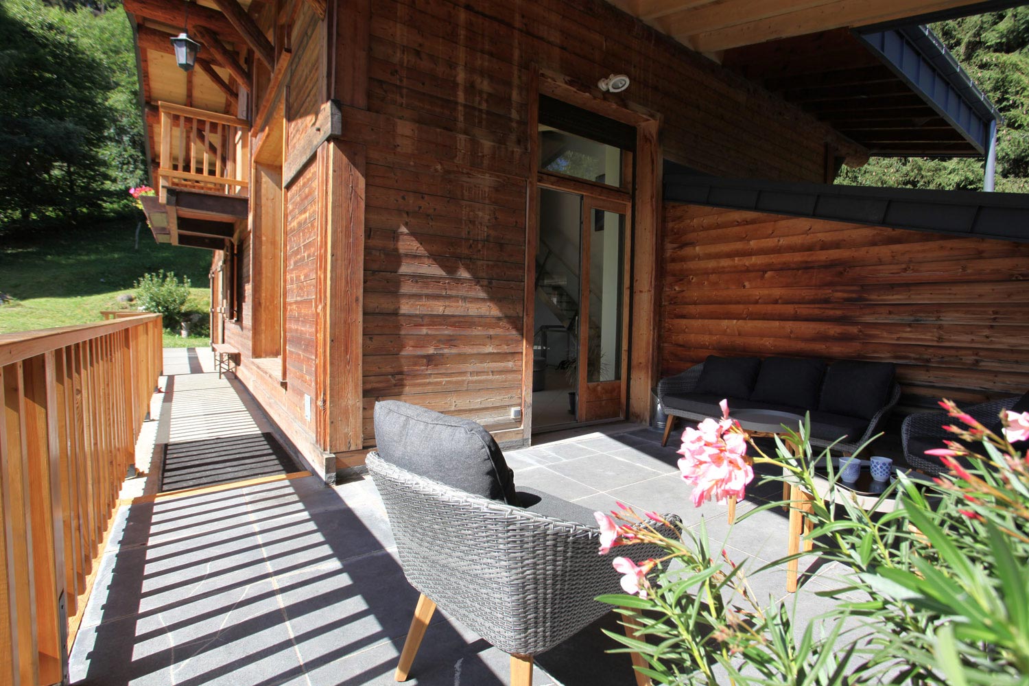 Outside there is a long terrace with seating area to one end with majestic views of the Mont-Blanc Mountain Range and the huge garden and adjoining forest.
