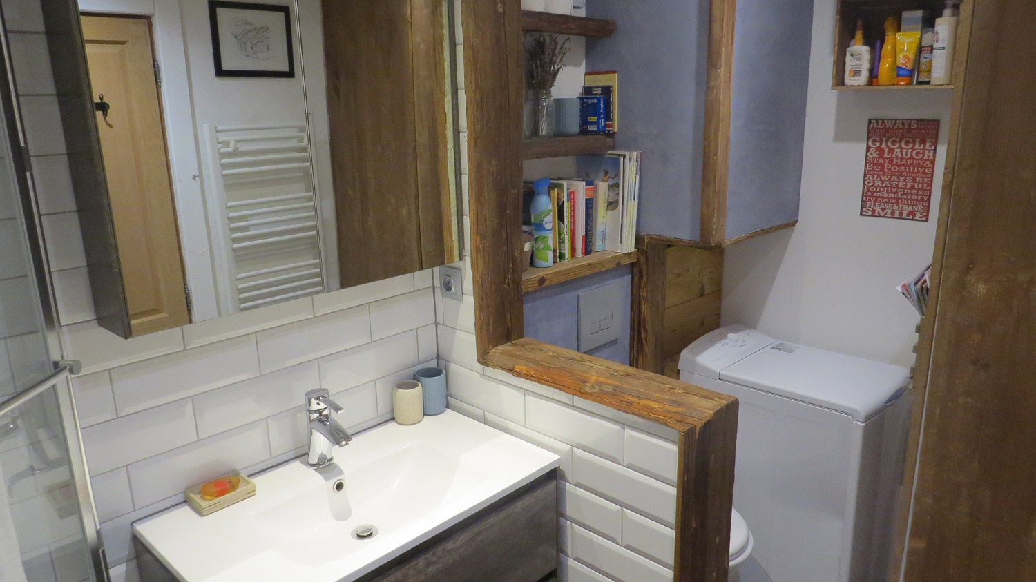 There is one bathroom with bath/shower, sink, washing machine and a towel rack dryer.