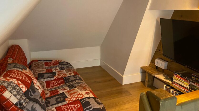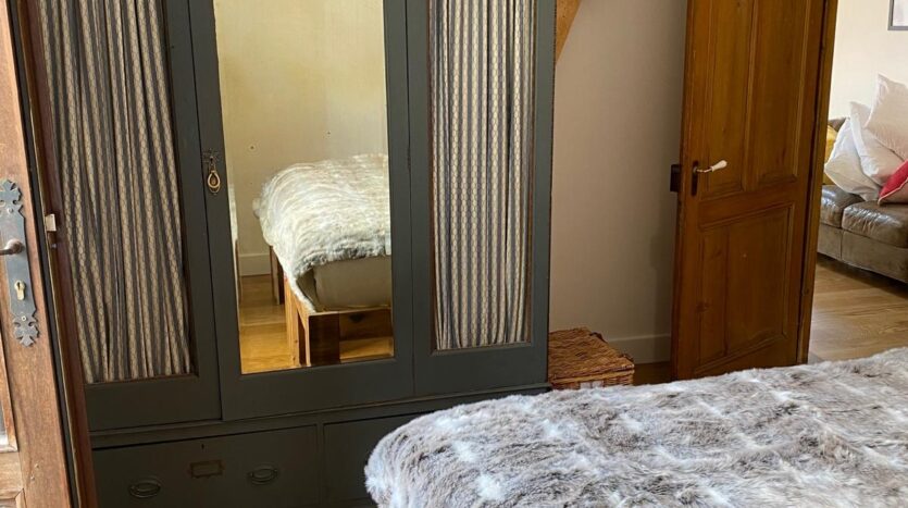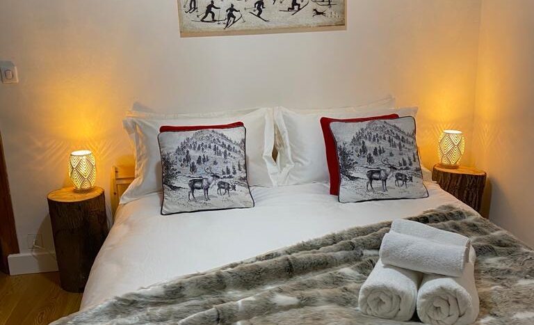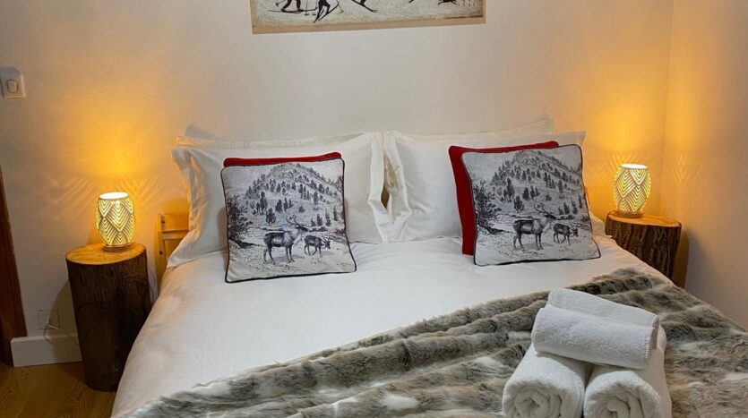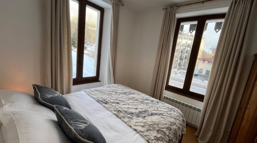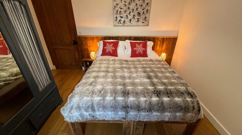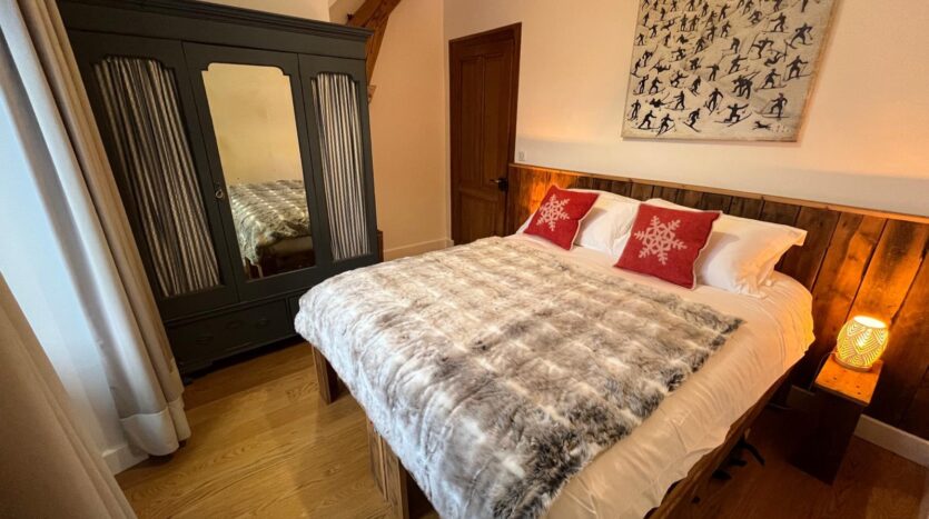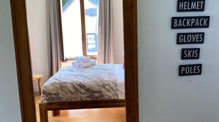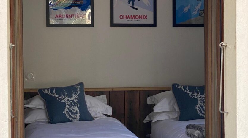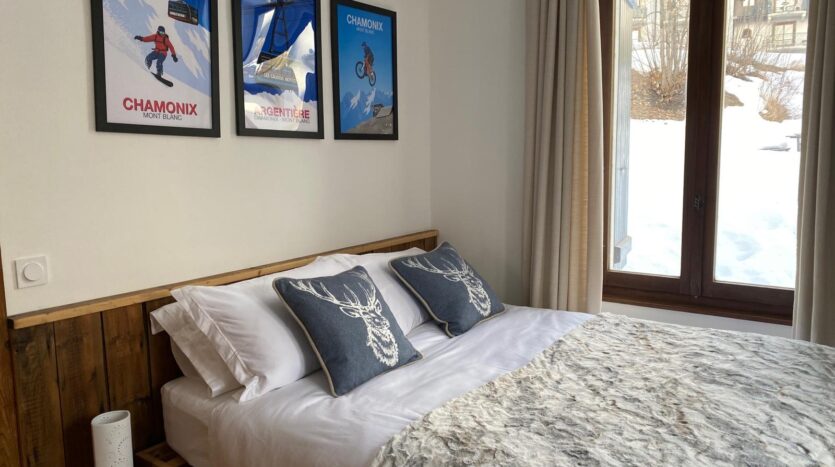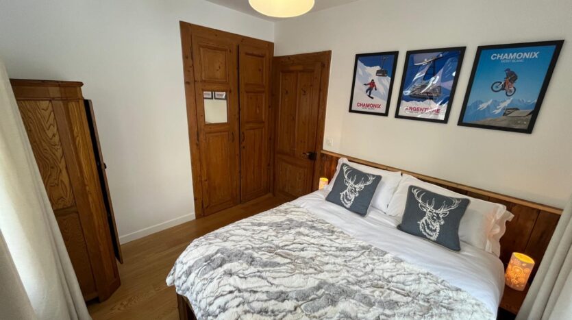 Bedroom 3: The third bedroom has a double bed (160 x 200 cm), which can also be made up into 2 singles; wardrobe. Views of the Grand Montets Massif.