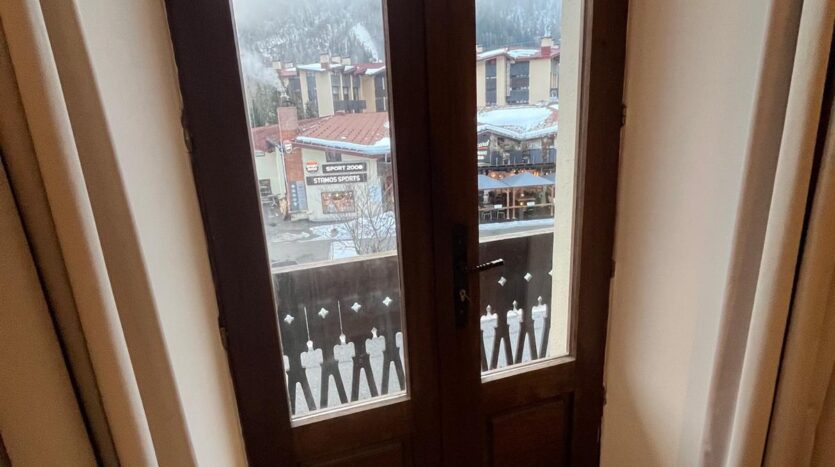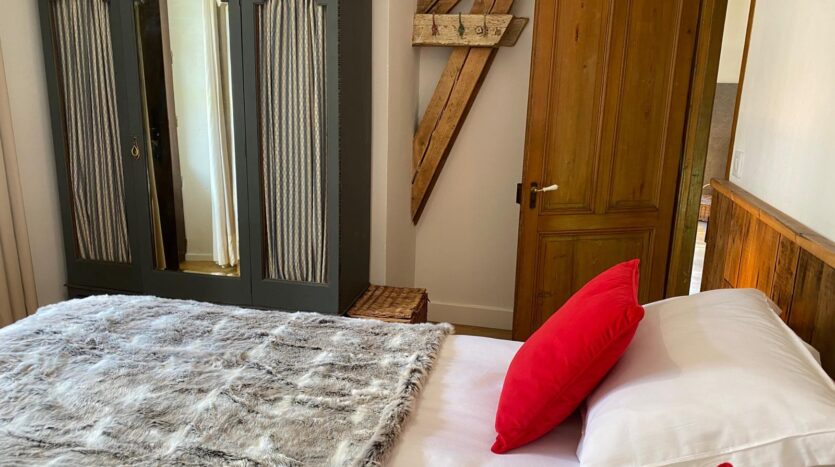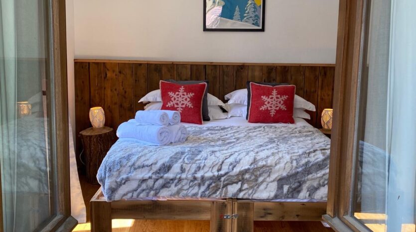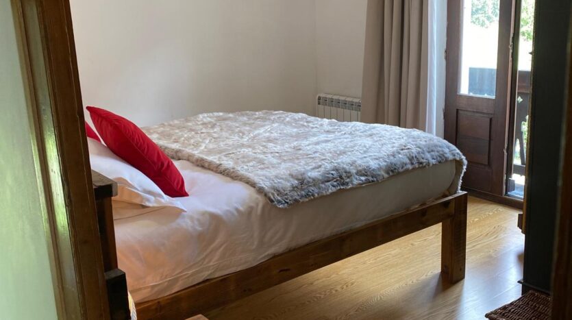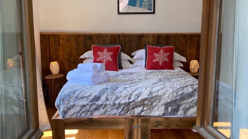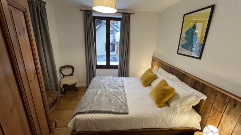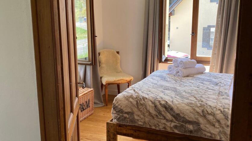 Bedroom 1: Double bedroom is on the first floor with French windows opening onto a small balcony. It is beautifully furnished with a double bed (160 x 200cm) which can also be made up into 2 singles; large wardrobe. Views of the Grand Montets Massif.
