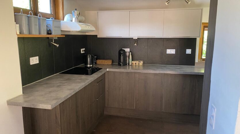 The modern kitchen is adjacent to the living area. It is beautifully laid out with sleek modern units and fully equipped with a cooker hob, oven, microwave, dishwasher, Nespresso coffee machine, kettle, toaster and fridge/freezer, making catering a breeze. There are fondue and raclette sets allowing for a traditional cosy alpine night at home.