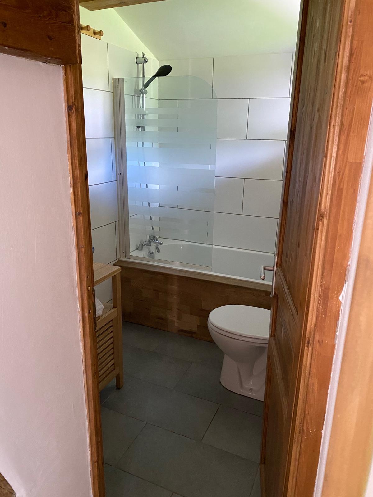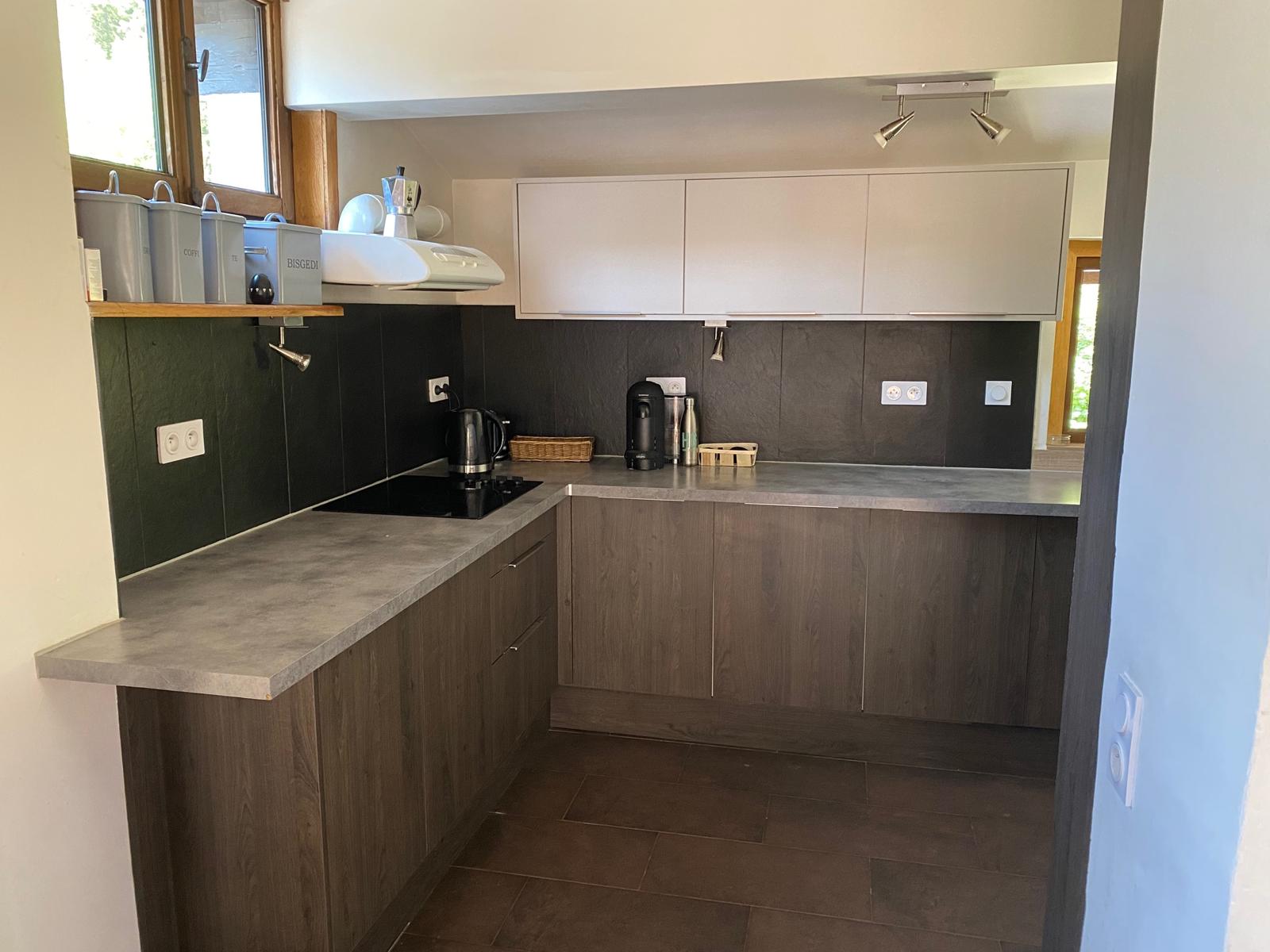 The modern kitchen is adjacent to the living area. It is beautifully laid out with sleek modern units and fully equipped with a cooker hob, oven, microwave, dishwasher, Nespresso coffee machine, kettle, toaster and fridge/freezer, making catering a breeze. There are fondue and raclette sets allowing for a traditional cosy alpine night at home.