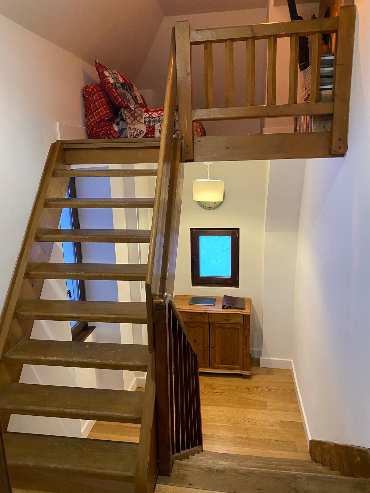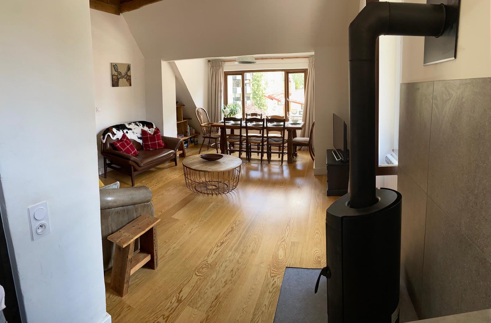 The main living area is positioned on the first floor to take advantage of the view of the Grand Montets ski area. The open-plan living area has high wooden eaves and large windows making it airy and full of light. The seating area is furnished with 2 chic leather sofas, a wood-burning stove, a flat-screen TV and a large wooden dining table and chairs for 7 people.