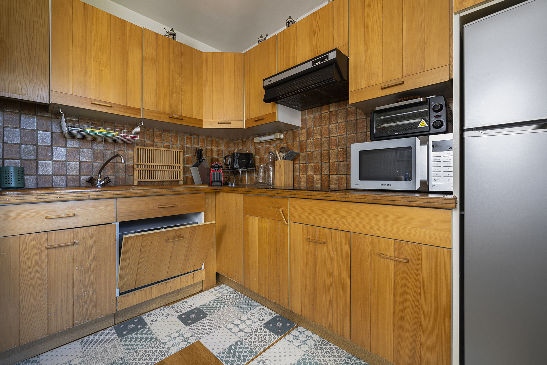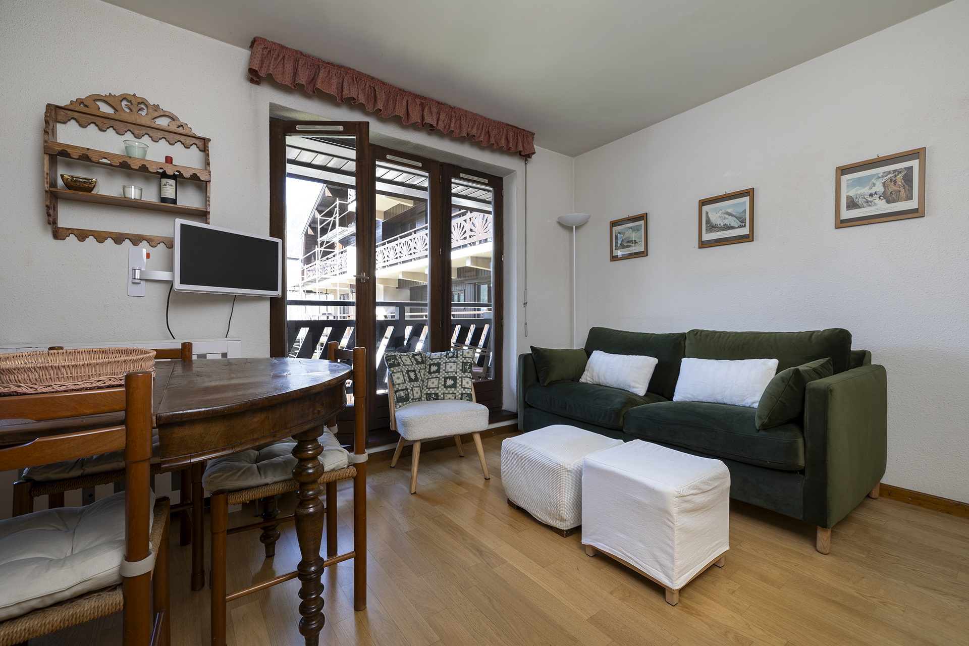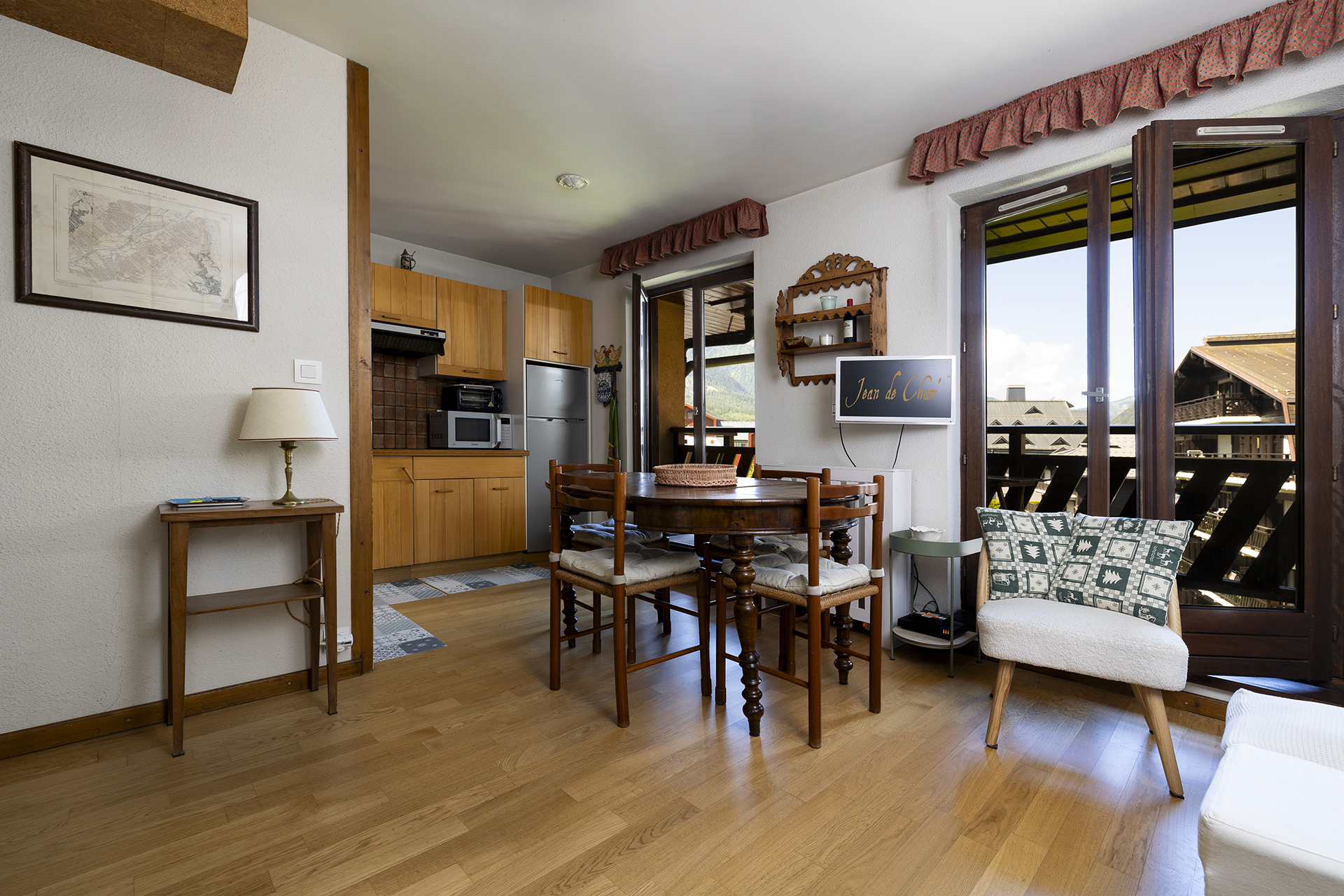 A semi-open, fully equipped kitchen that opens onto the balcony terrace facing Mont Blanc. South and west exposure. very bright living room/dining room area with access to the balcony terrace, giving you a magnificent view of the entire Mont Blanc range.