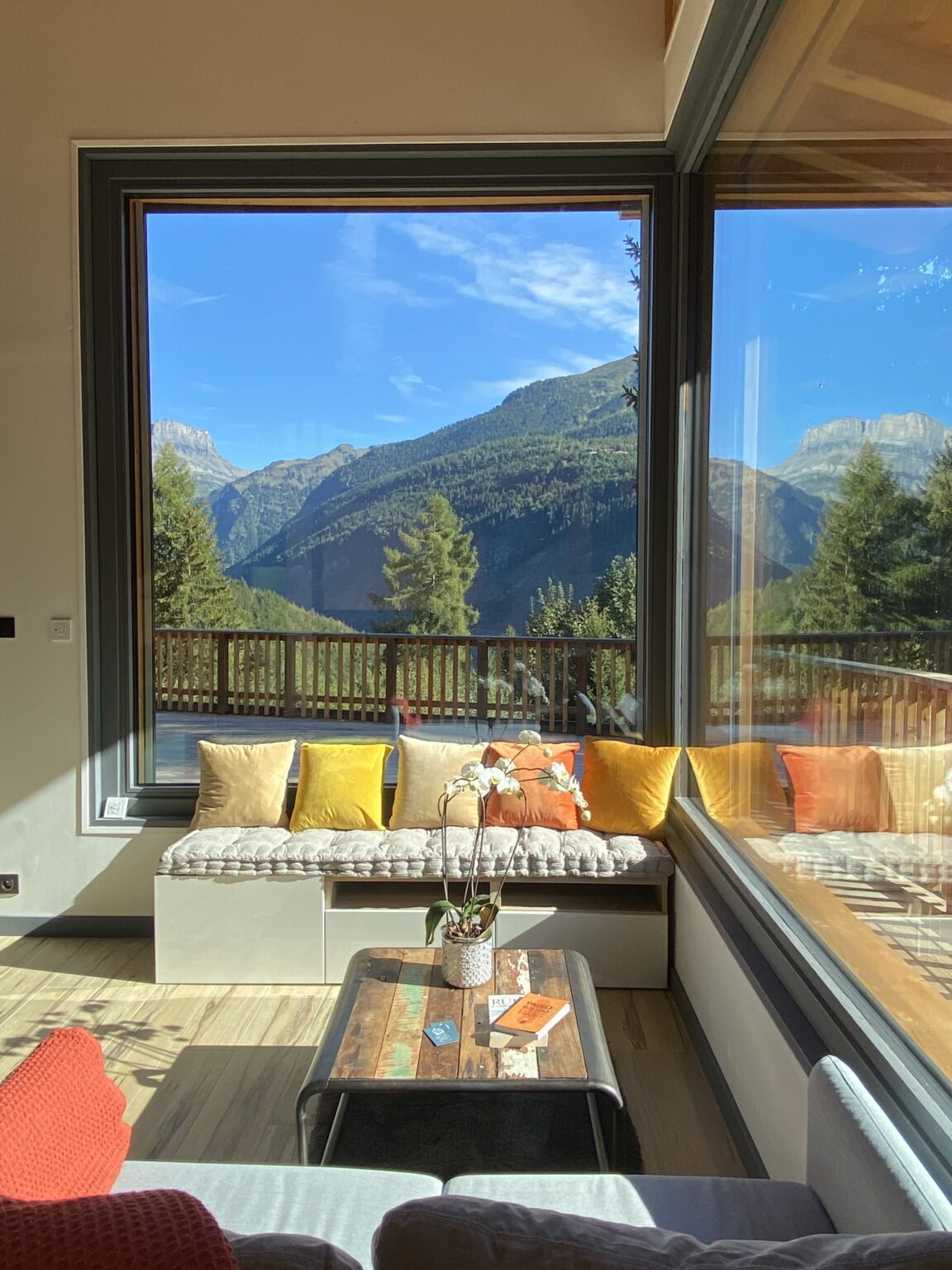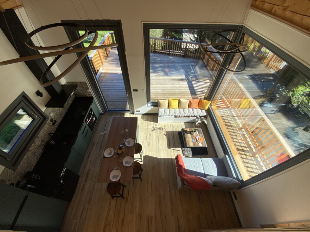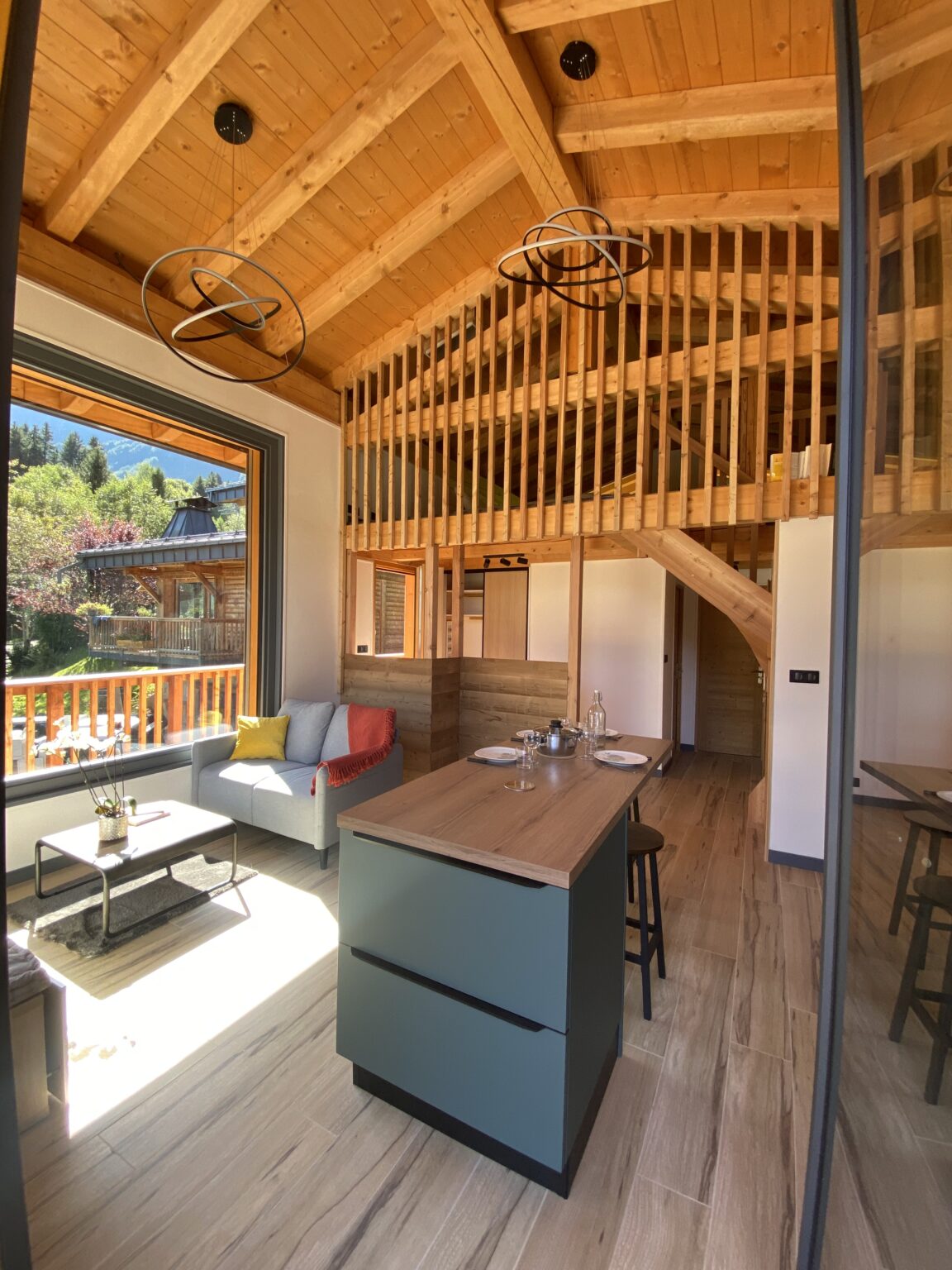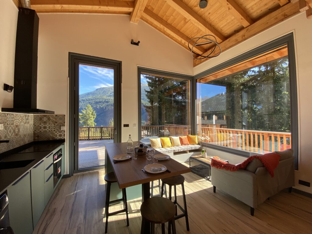 The 57m2 accommodation features a living room with large openings allowing you to admire both the majestic Fiz mountain and the Mont Blanc massif. The open plan kitchen is equipped (refrigerator, oven, hob, washing machine) and gives access to a spacious outdoor terrace. It offers a double (or twin) bedroom, a shower room and a separate toilet. The mezzanine floor has been designed as a cozy little refuge with 2 single beds and a television.