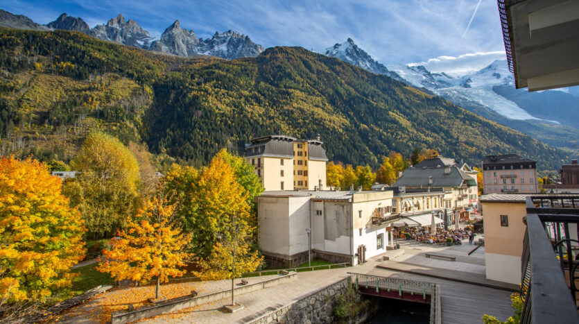 This is one of our favourite apartments in Chamonix Centre. It’s very spacious and light, with high ceilings and is perfect for remote working, or entertaining guests. The apartment is situated in a fantastic location in Rue des Moulins, on the quiet, south facing side, overlooking the river.  This famous pedestrian street is lined with with a great choice of restaurants, bars and coffee shops and has a great feel, just tucked away from the bustle of the main shopping street. The apartment is located on the 3rd Floor of the majestic building that was originally Queen Victoria’s holiday residence.