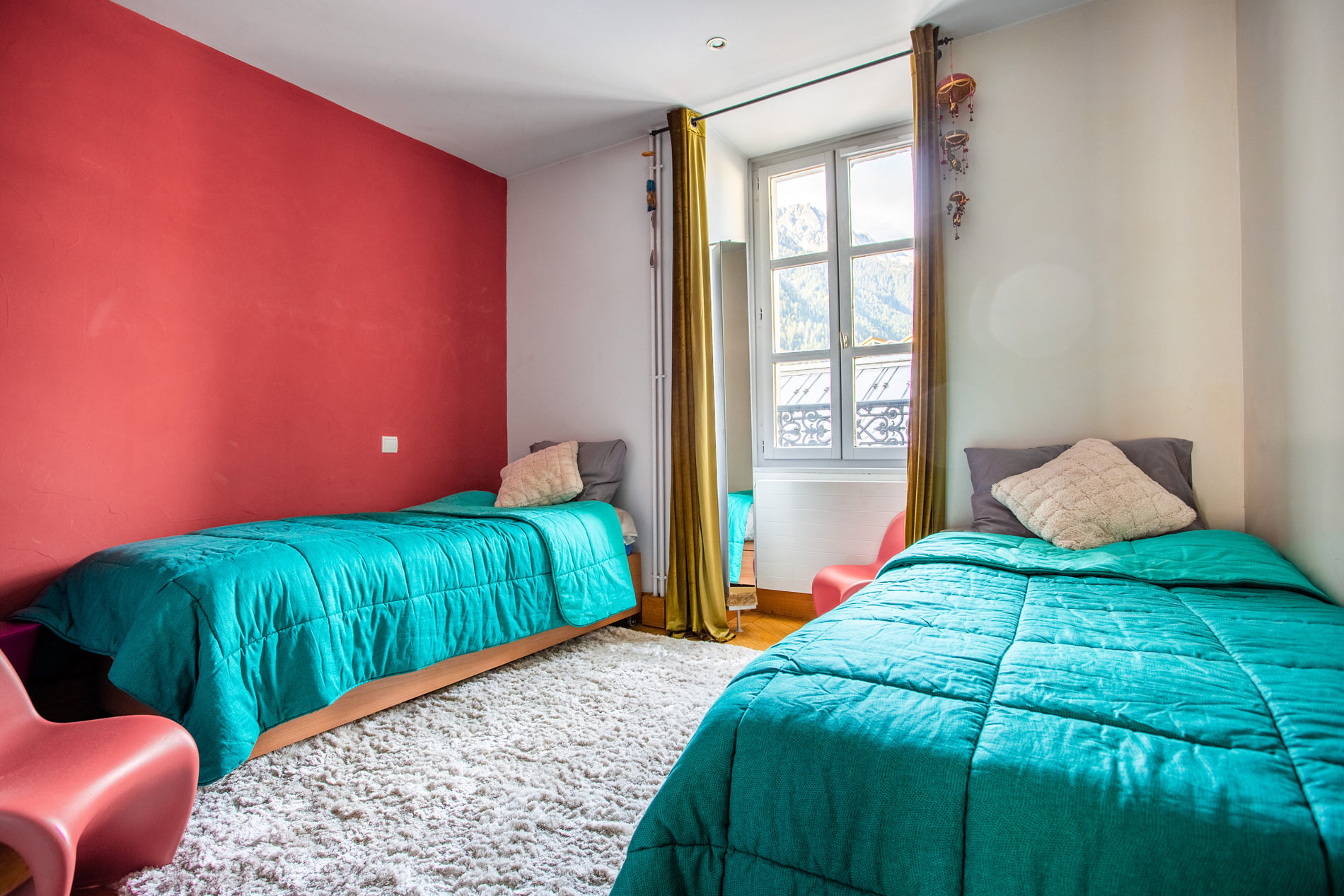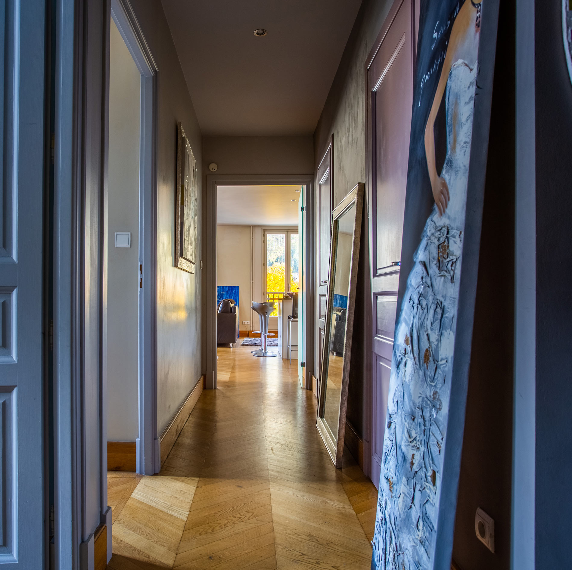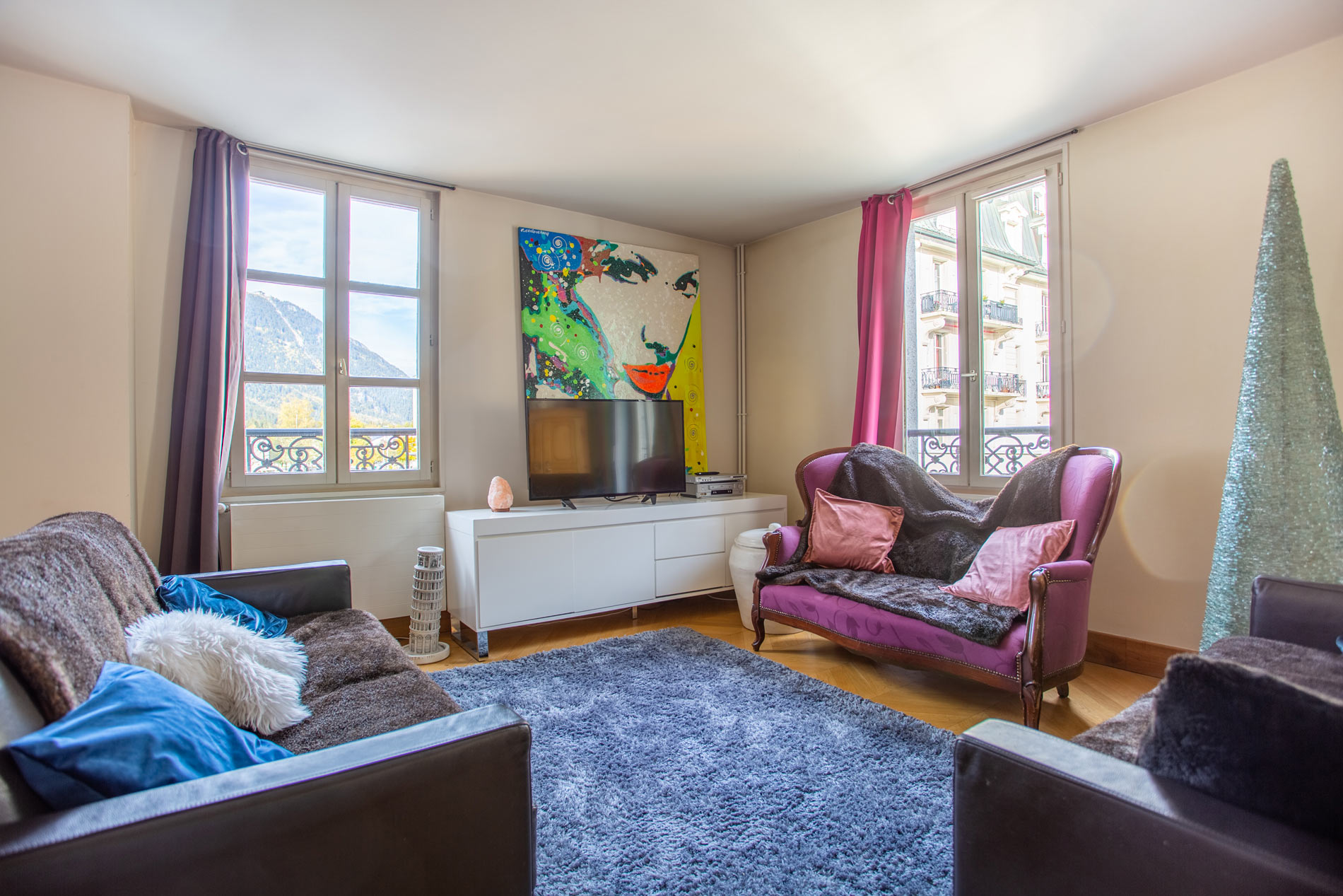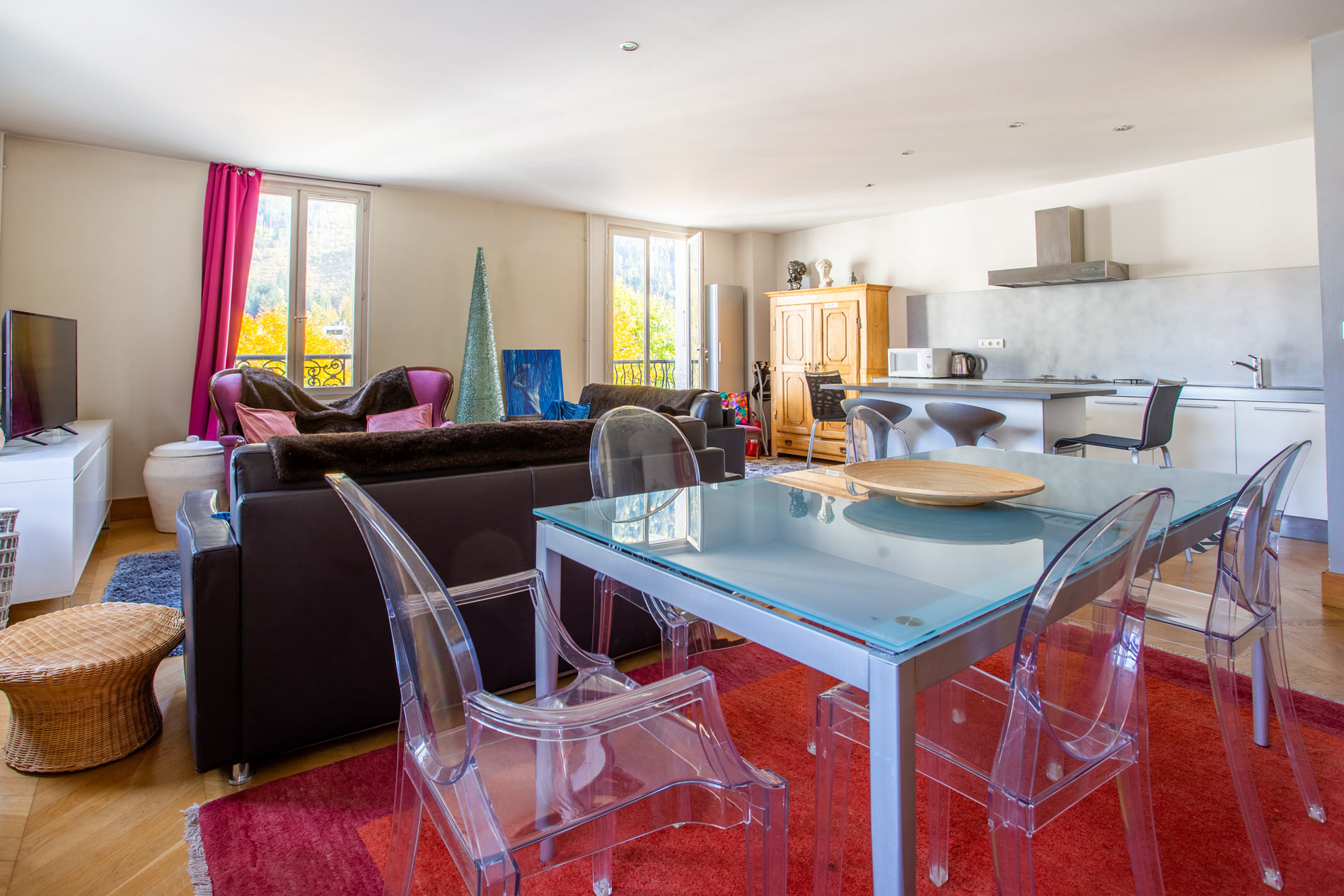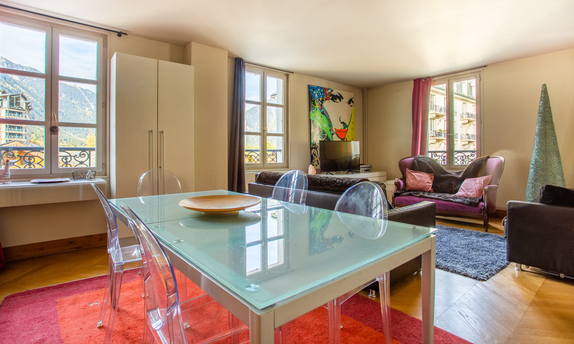 This is one of our favourite apartments in Chamonix Centre. It’s very spacious and light, with high ceilings and is perfect for remote working, or entertaining guests. The apartment is situated in a fantastic location in Rue des Moulins, on the quiet, south facing side, overlooking the river.  This famous pedestrian street is lined with with a great choice of restaurants, bars and coffee shops and has a great feel, just tucked away from the bustle of the main shopping street. The apartment is located on the 3rd Floor of the majestic building that was originally Queen Victoria’s holiday residence.