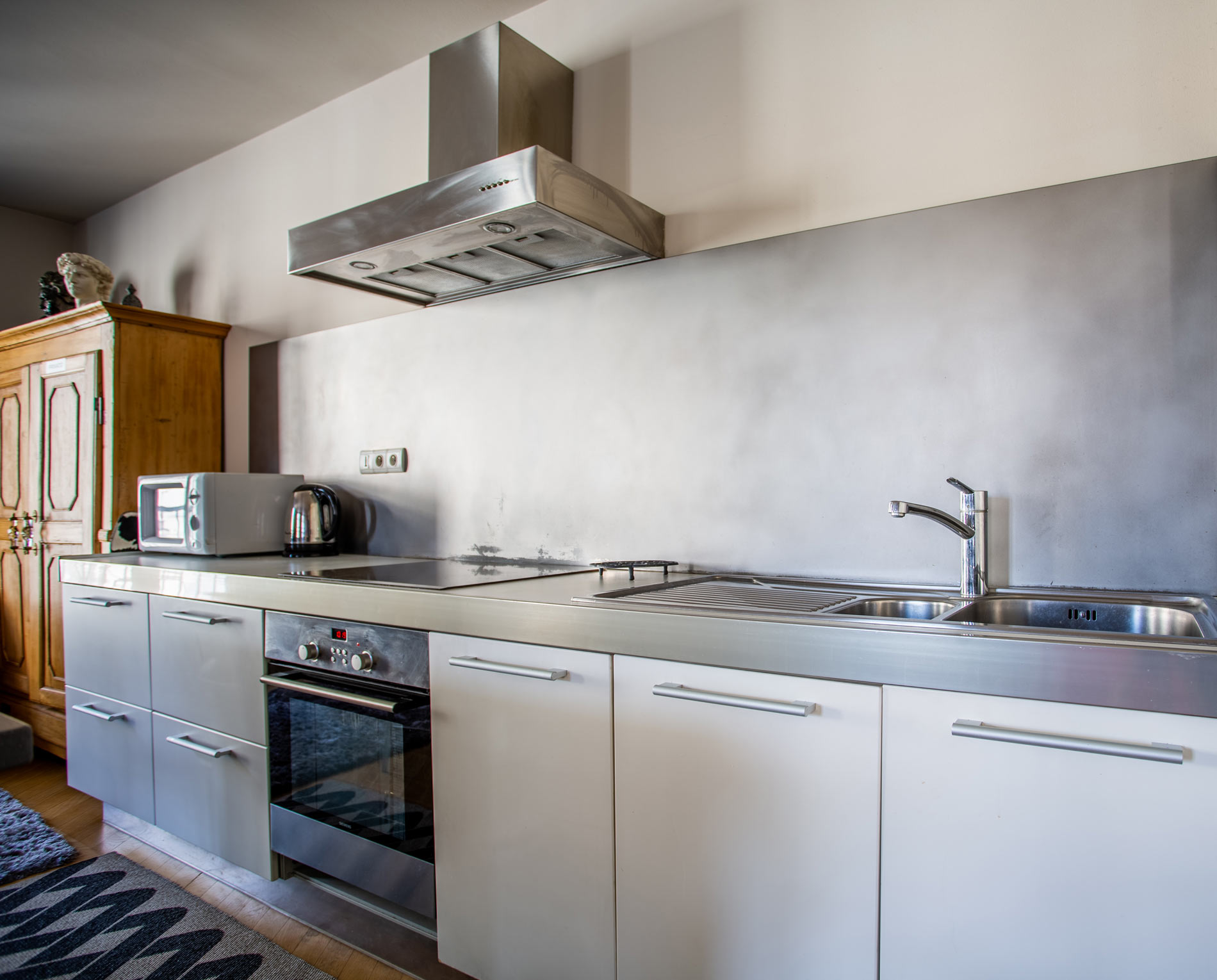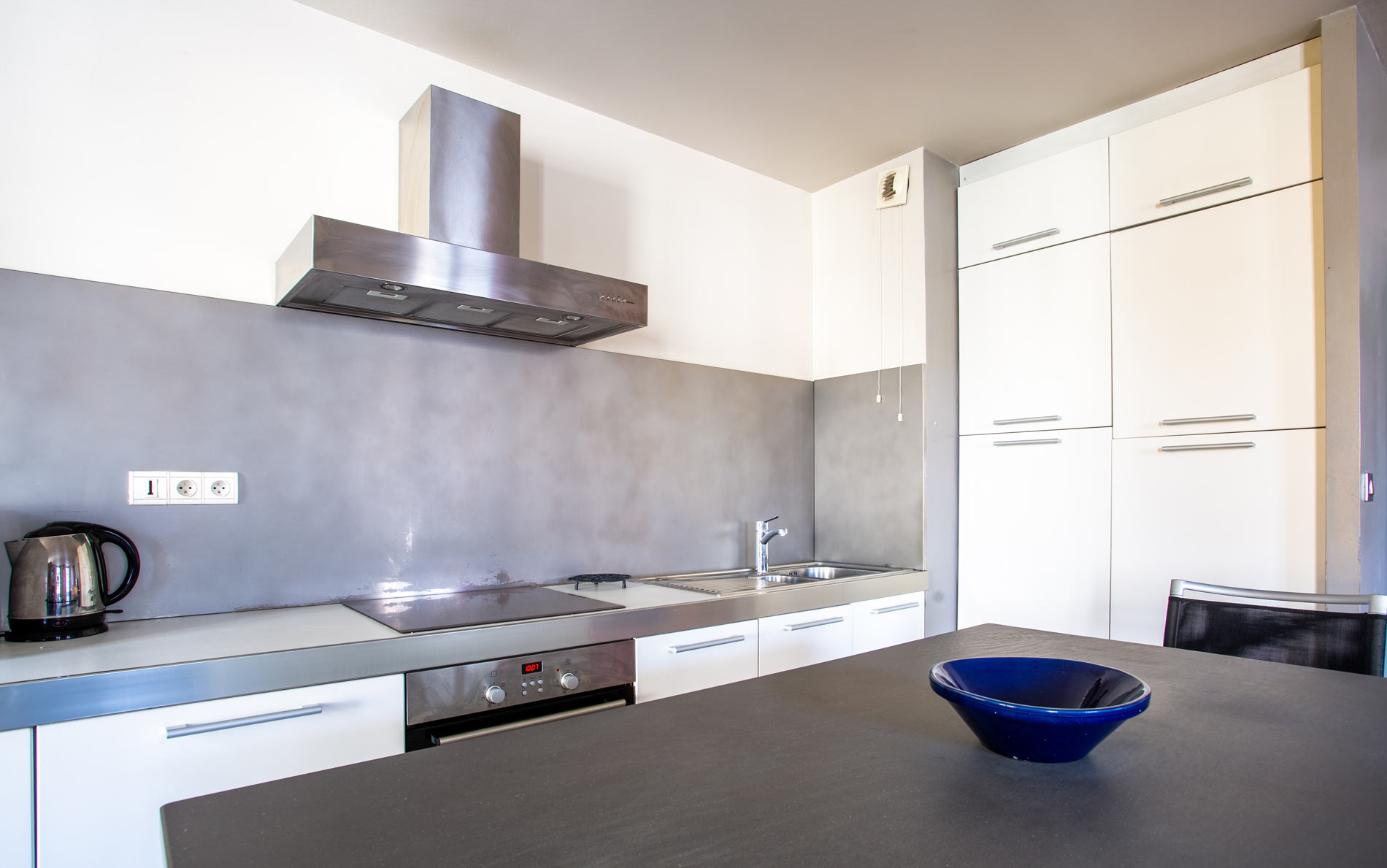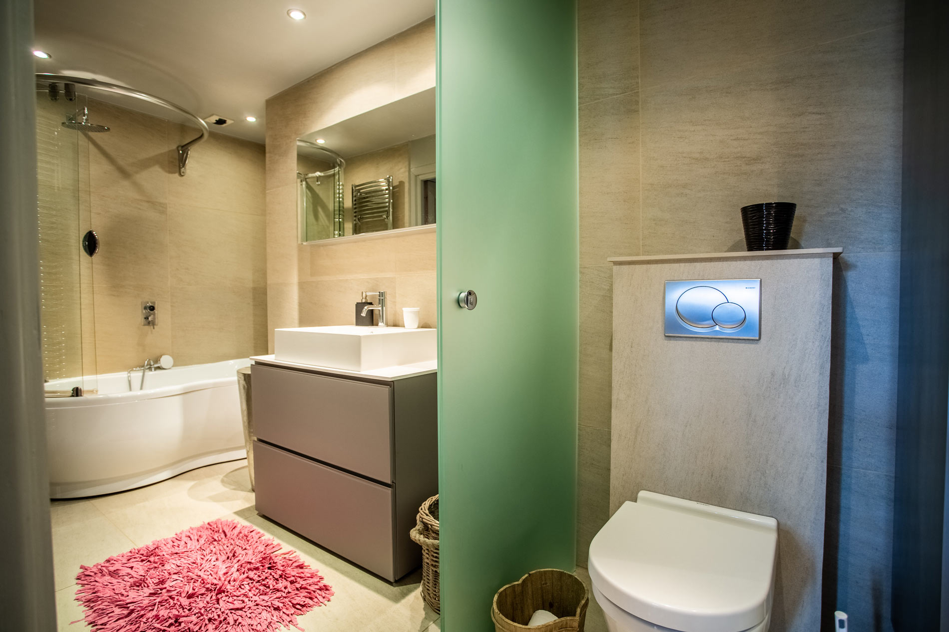 The lounge is spacious with a modern open-plan kitchen and dining area. There is an ‘island’ bar in the kitchen area, and the dining area has a beautiful glass table that can accommodate 10 diners. The lounge area has comfy leather sofas, which convert into top-quality sofa-beds to accommodate occasional guests. The apartment comes with WiFi and is ideal for a home-working environment. The apartment has two bedrooms arranged as a double (with kind size bed), and a twin (the beds can be joined together to make a king). Both bedrooms share a luxurious bathroom with bath and shower, and a separate WC.
